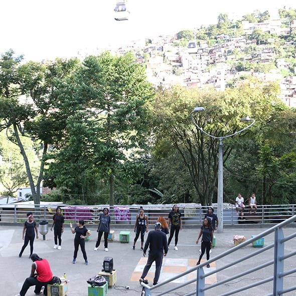 Con un parlante desgastado, conectado con metros de cable a un enchufe de una casa vecina, vestidos de negro, pero sin uniforme, estos jóvenes se reúnen cuatro días a la semana: lunes, miércoles, viernes y domingo, durante dos horas continuas. Lo hacen en la plazoleta externa al inferior de la estación Vallejuelos del metrocable, en la comuna 7. Calientan, se estiran, danzan, repiten una y otra vez los pasos que retumban en la calle, ante la mirada atenta de niños, pasajeros del sistema o vecinos de la zona, en medio de un ‘cañón’ de humildes casas de ladrillo, madera, plástico y zinc.