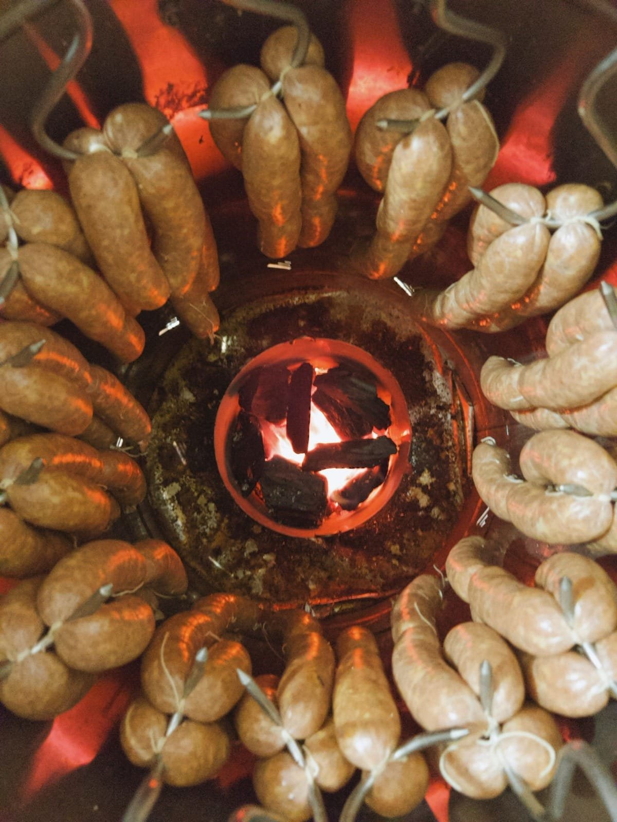 Hasta el comedor llega el aroma a carne y especias. El chirriar de la parrilla empieza a inquietarnos el paladar. Cuando Sandra se acerca a la mesa con el plato de chorizos humeantes inevitablemente se nos hace agua la boca. A la vista el argentino, el picante y el tradicional, cuñados con dos arepas y una rodaja de limón nos parecen demasiado, pero al partirlos, calientes y jugosos, y llevarnos el primer trozo a la boca, se nos antoja no parar de comer. En cada mordida el sabor a vino blanco, a cominos, a carne de cerdo, a ajo, a cebolla junca y a pimienta cayena hacen fiesta en nuestro paladar, pero también en nuestro espíritu, porque nos recuerdan al pueblo, a la casa de la niñez, al fogón, a la abuela, a nuestras raíces antioqueñas.